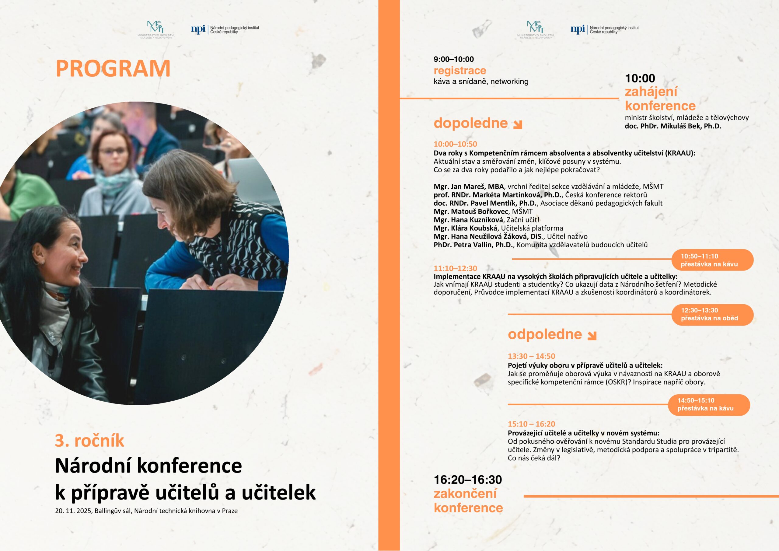 V prostorách Národní technické knihovny v Praze se 20. 11. 2025 uskutečnil třetí ročník Národní konference k přípravě učitelů a učitelek, pořádaný Ministerstvem školství, mládeže a tělovýchovy. Akce opět propojila akademickou obec, školy, státní správu i další partnery, kteří společně hledají cesty, jak zajistit dostatek kvalitně připravených pedagogů pro české školy. Více viz tisková zpráva MŠMT.