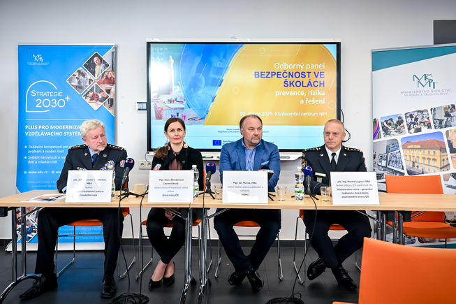 V úvodním bloku Jan Mareš z Ministerstva školství, mládeže a tělovýchovy představil vizi „bezpečné školy“ jako prostředí, které zajišťuje fyzickou, psychickou i sociální bezpečnost všech žáků a zaměstnanců. Zdůraznil legislativní rámec, klíčové prvky Minimálního standardu bezpečnosti a úlohu škol při prevenci rizik a připravenosti na mimořádné události. Šárka Benešová z Krajského úřadu Karlovarského kraje sdílela zkušenosti s realizací komplexního projektu zabezpečení škol, který zahrnuje technická i organizační opatření a dlouhodobou spolupráci s IZS. Uvedla příklady dobré praxe, zejména z oblasti kamerových systémů, pravidelných nácviků krizových situací a metodické podpory škol. Marcela Erbeková, ředitelka ZŠ T. G. Masaryka Mnichovice, představila praktická opatření zavedená na své škole – od recepce a kamerových systémů po pravidelná školení a krizové plány. Popsala také konkrétní zkušenost s evakuací školy při nálezu munice a následná opatření pro zlepšení připravenosti.