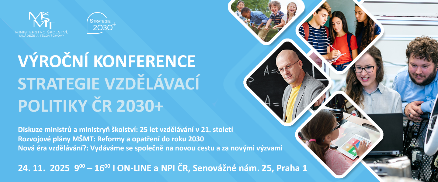 Zveme Vás na Výroční konferenci Strategie vzdělávací politiky ČR 2030+, která se uskuteční v pondělí 24. listopadu 2025 hybridní formou v prostorách NPI ČR na Senovážném náměstí 25 v Praze a online přes youtube MŠMT. Od 9:00 do 16:00 nabídne jedinečnou příležitost ohlédnout se za 25 lety českého školství v 21. století, diskutovat o jeho proměnách a společně hledat cesty, jak naplnit vizi moderního vzdělávání do roku 2030.